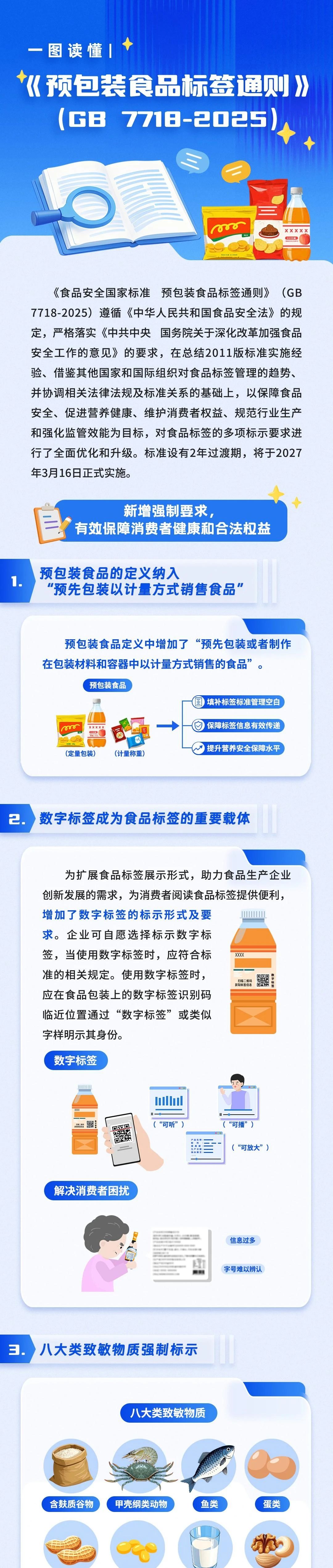 《食品安全国家标准 预包装食品标签通则》(GB7718-2025)遵循《中华人民共和国食品安全法》的规定,严格落实《中共中央国务院关于深化改革加强食品安全工作的意见》的要求,在总结2011版标准实施经验、借鉴其他国家和国际组织对食品标签管理的趋势,并协调相关法律法规及标准关系的基础上,以保障食品安全、促进营养健康、维护消费者权益、规范行业生产和强化监管效能为目标,对食品标签的多项标示要求进行了全面优化和升级。标准设有2年过渡期,将于2027年3月16日正式实施。