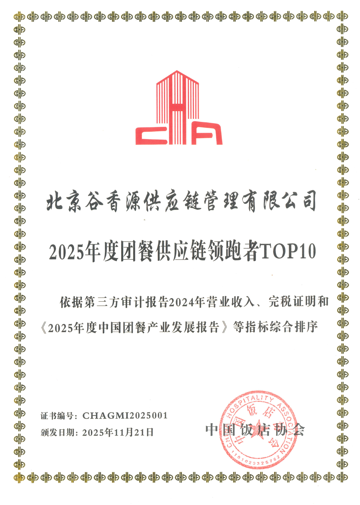 今日,北京谷香源供应链管理有限公司再传捷报——凭借2024年稳健的营收、规范的纳税,以及在团餐产业链中的资源整合能力,再次跻身“团餐供应链领跑者TOP10”名单。这份由中国饭店协会依据第三方审计与行业报告评选的认可,是市场对谷香源供应链服务能力的充分肯定。